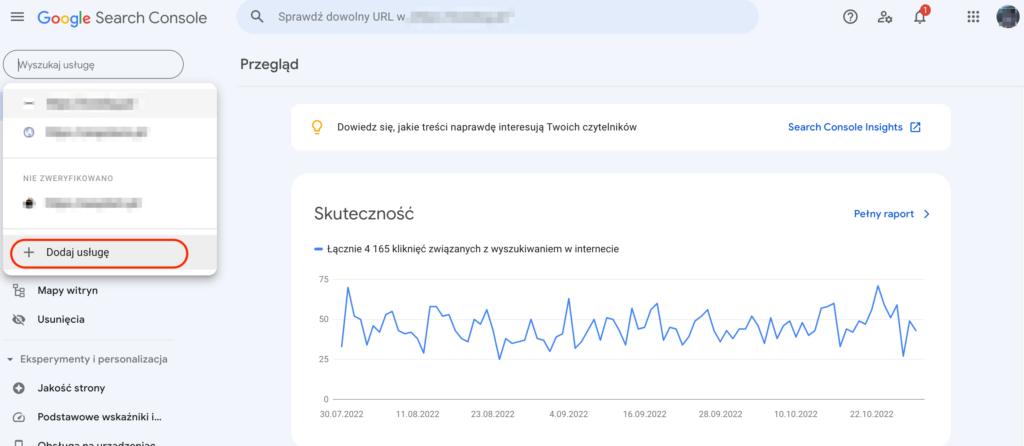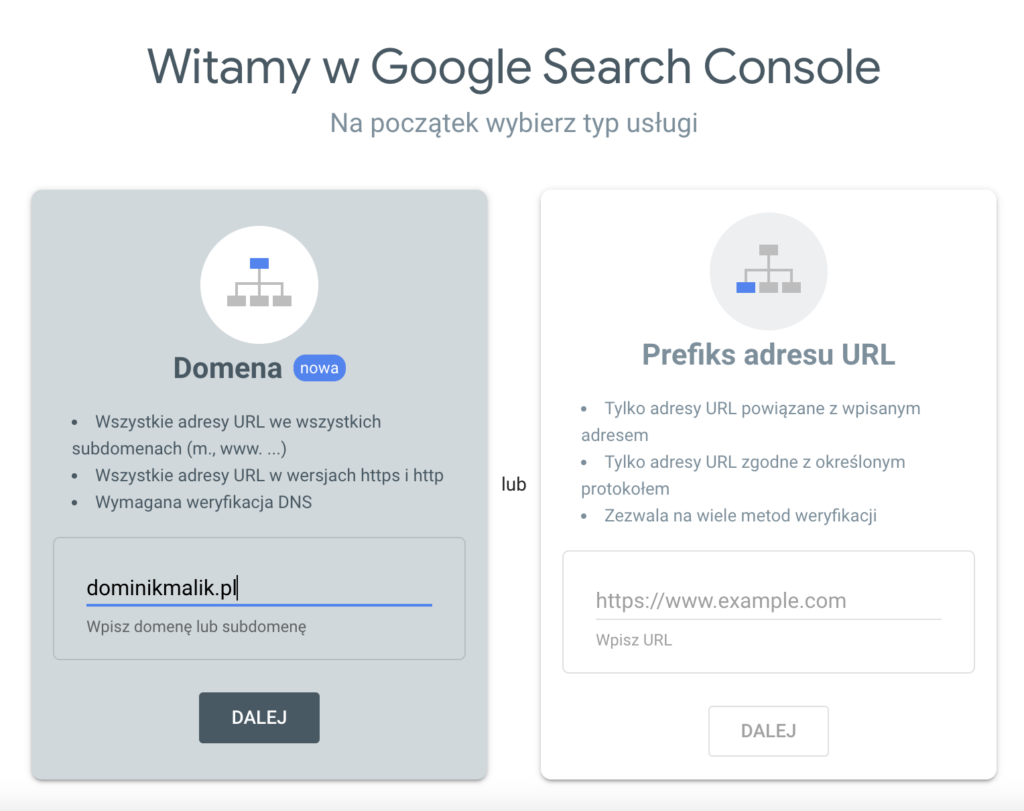Jeśli wcześniej już podpiąłeś Analytics na swoją witrynę i jesteś zalogowany na tym samym koncie google, to dodanie Search Console będzie bardzo łatwe, bo generalnie sprowadzi się jedynie do wpisania nazwy Twojej domeny 🙂