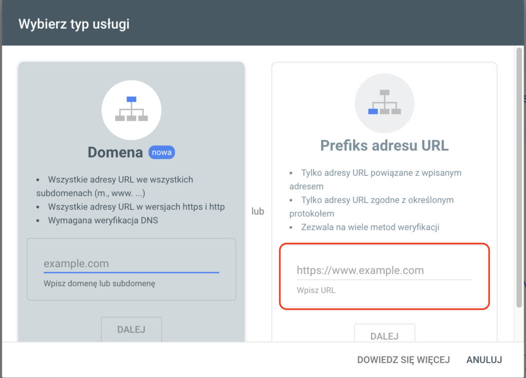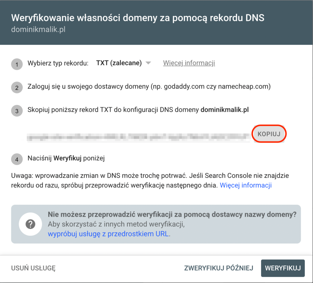 Jeśli chcielibyśmy weryfikować Search Console za pomocą domeny, to oczywiście możemy to zrobić, jednak wymaga to wiedzy w jaki sposób dodawać rekordy DNS do domeny, a także jest zależne od tego jakiego mamy operatora domeny, ponieważ każdy operator może mieć inny panel i może to inaczej wyglądać – jednak działanie jest takie samo. Trzeba też pamiętać, że czas przetworzenia rekordu DNS może zająć nawet do 24h.