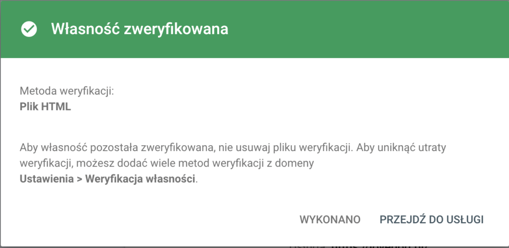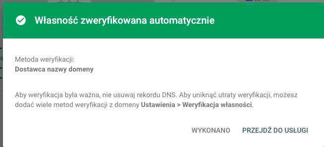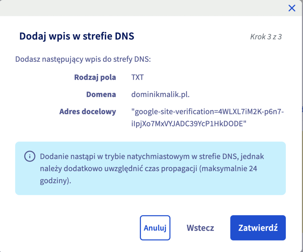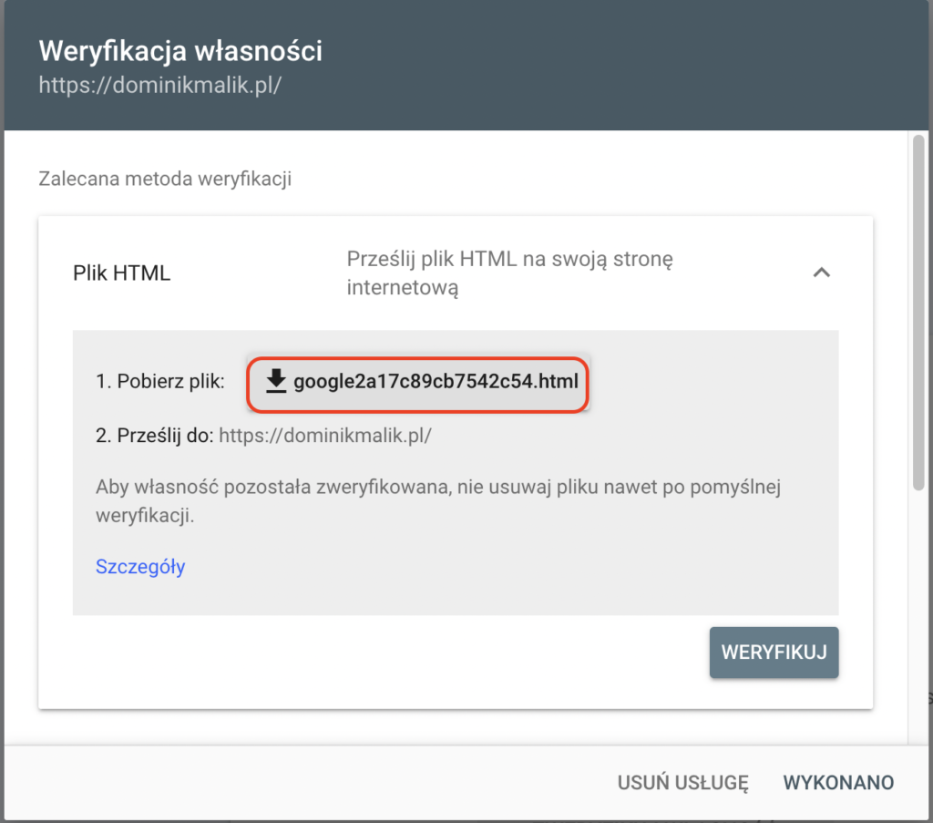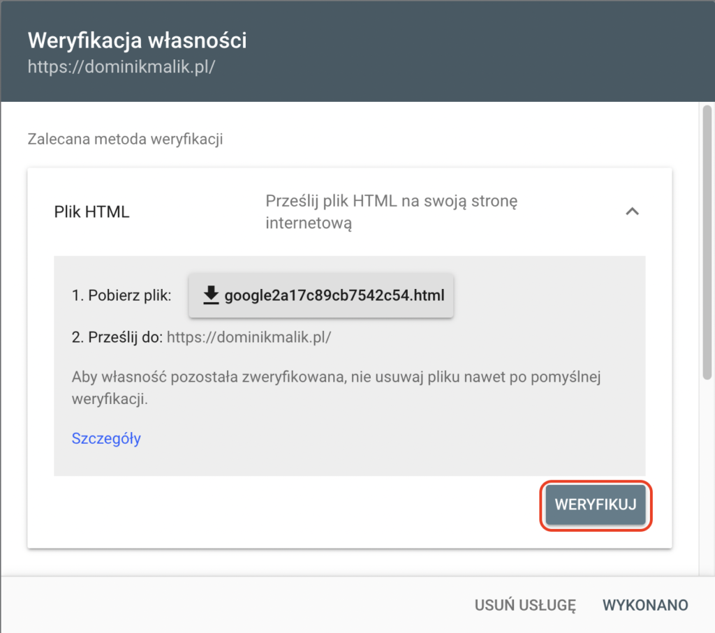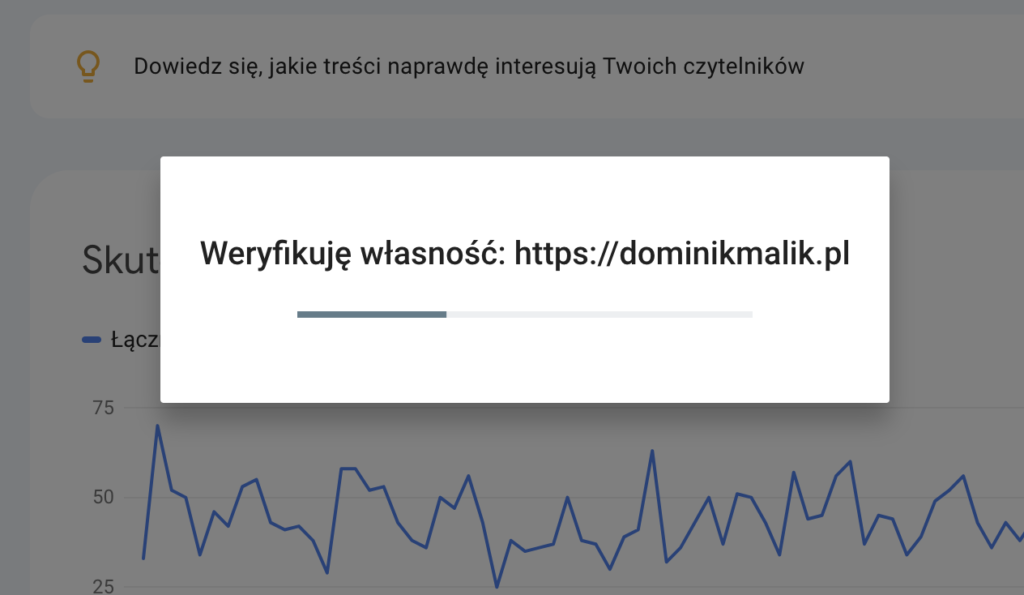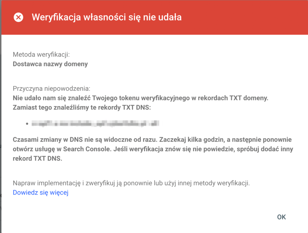 Po powrocie na kartę Search Console możemy kliknąć „Weryfikuj”. W moim przypadku po kliknięciu pokazało się następujące okienko: