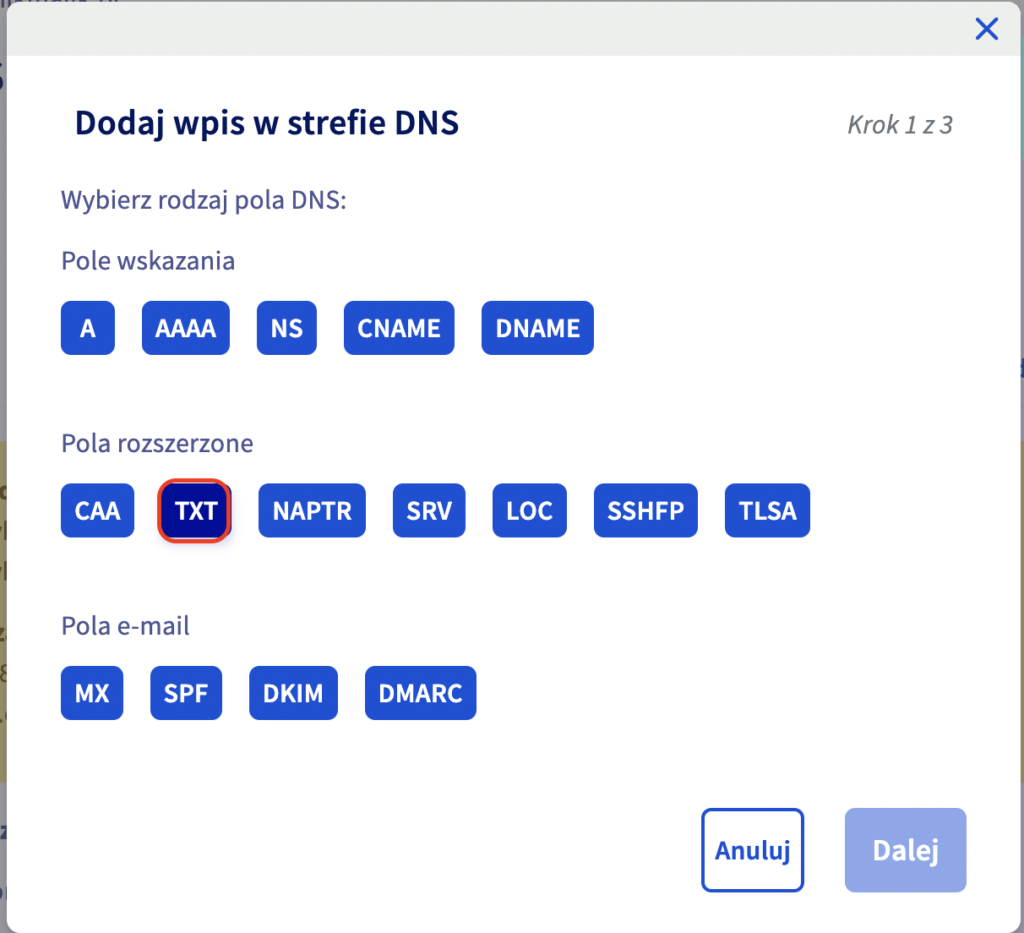 W ustawieniach domeny mamy przycisk Dodaj rekord DNS. Klikamy, a następnie pojawia się okienko, tu zaznaczamy TXT i klikamy dalej 🙂