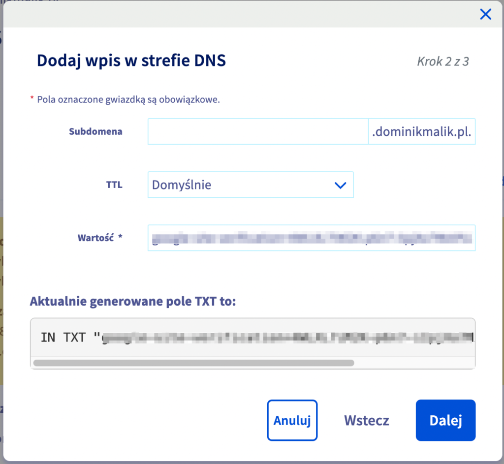 Wklejamy rekord DNS, który wcześniej skopiowaliśmy. Klikamy „Dalej”.